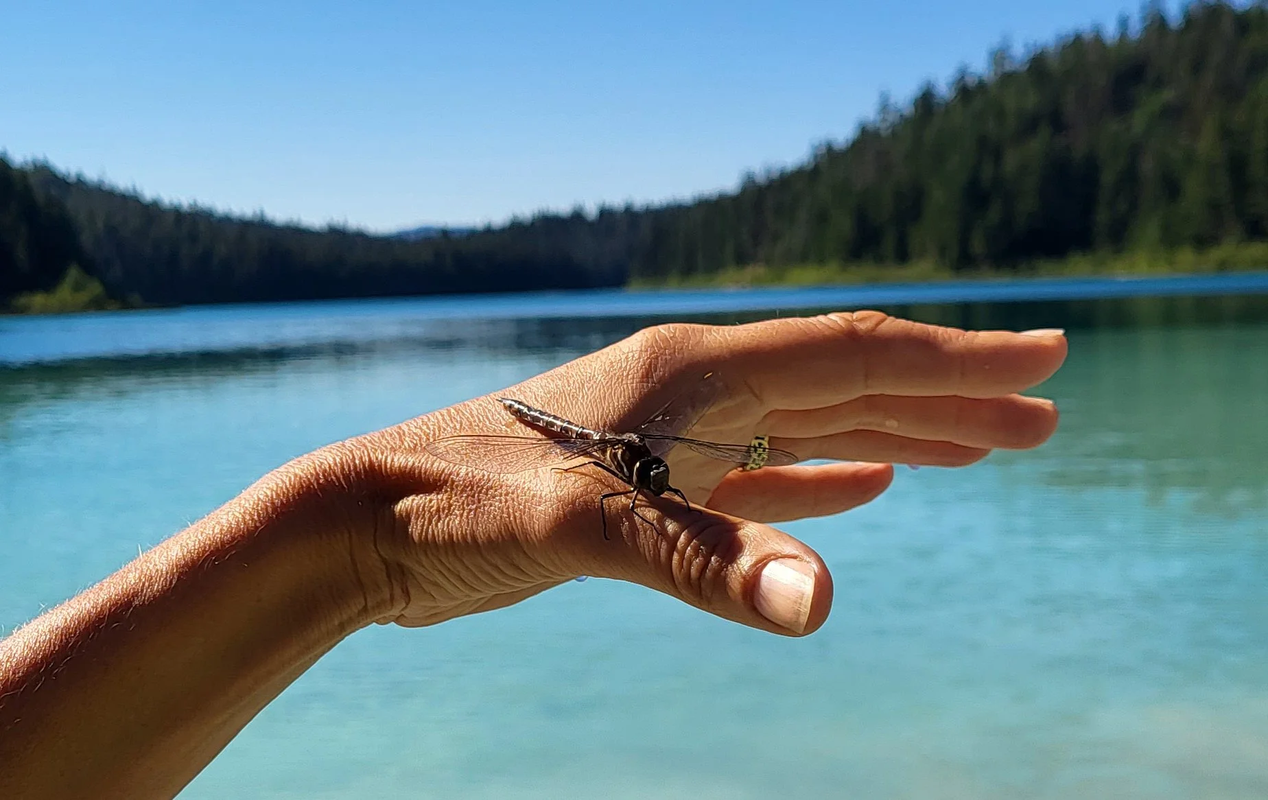 The other day my husband and I were at Kentucky Lake (an 90 minute drive from Kelowna BC. Its one of the most beautiful lakes I have ever visited, the colour of the water is exquisite with white sands and has an abundance of one of my favourite inspects, the mighty dragonfly. We were in the water when we spotted something floating a few metres in the distance - it was a dragonfly. I held out my hand and gently scooped him up. On closer inspection we could see he had a broken wing. I held him in the sunshine and spoke softly and prayed for his recovery.