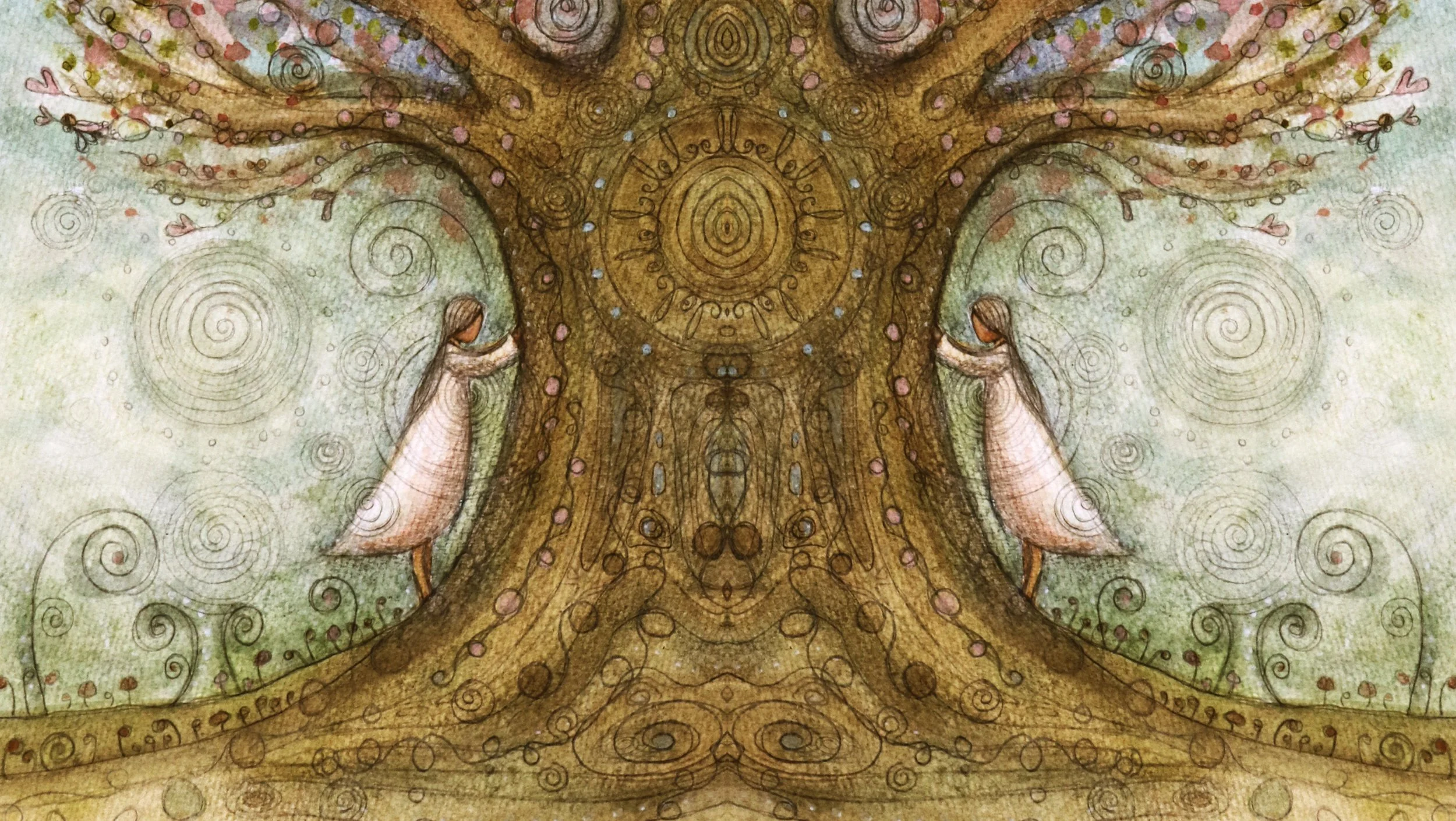 Imagine you are in the painting standing under Grandmother Tree - take a few deep breathes in; and slowly breathe out - exchanging breath with Grandmother Blossom. Place one hand on your heart and your other hand on her bark. Feel Grandmother Blossom’s love and healing energy flow through your entire being.