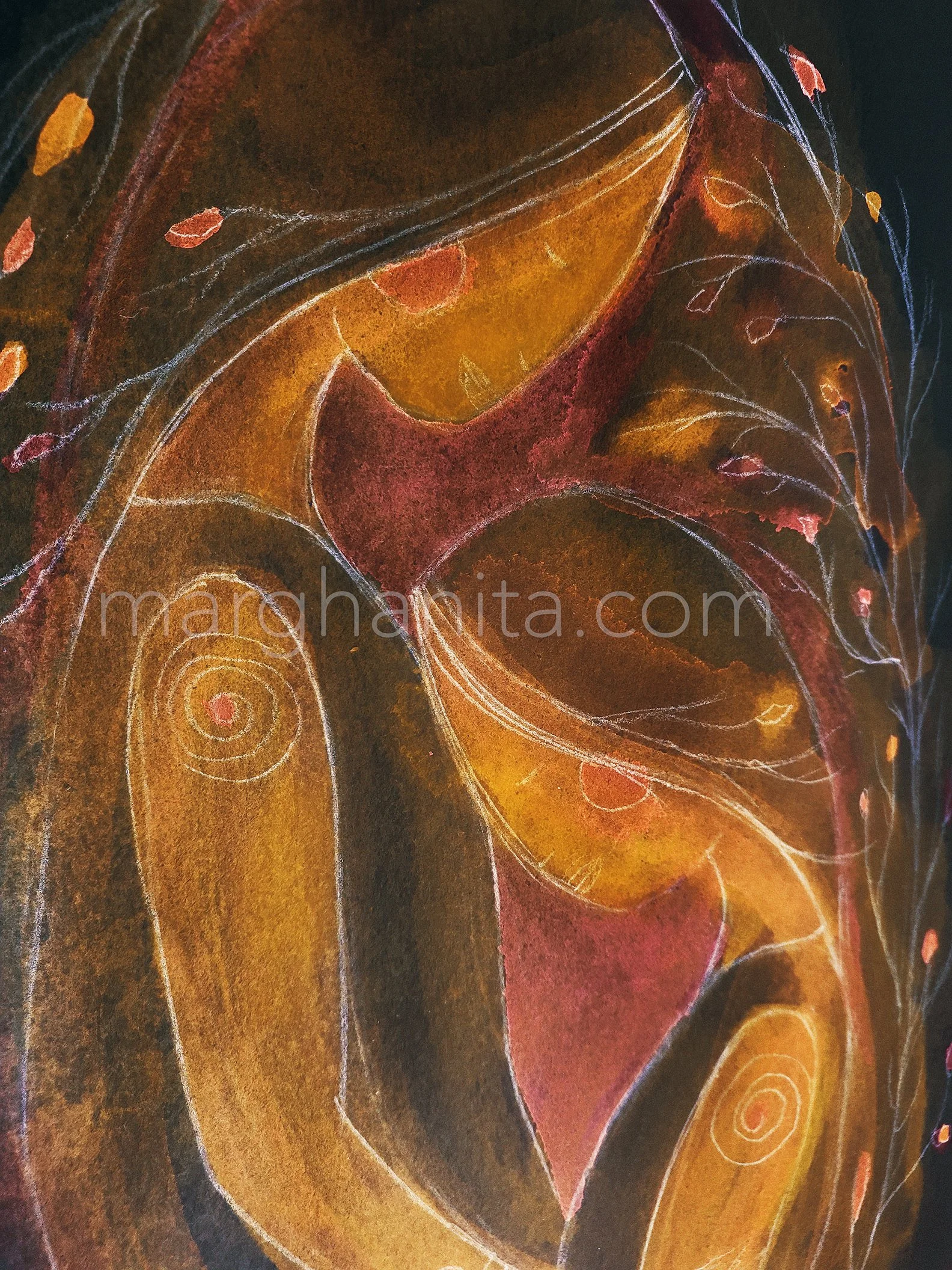 Original Artwork Wall Hanging - Conte, watercolour and acrylic on fabric canvas 26” x 26” (Mica Gold and French Turquoise natural earth paints are a feature on this canvas) Hoop and rod for hanging. Secret pocket on reverse of canvas containing a gem stone, simple meditation and blessing for the sacral chakra. Includes a mini print card.